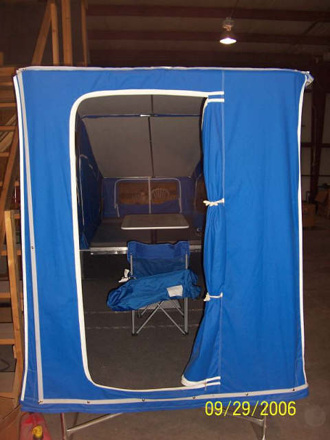 Photo above this one will show you your storage space for the items you brought when camper folded for travel. Attached are three rain poles that snap in when trailer set up. keeps tent roof tight so water goes down sides. Shown with included air mattress. Map table not available. Nice rectangle folding table with adjustable legs included with Deluxe and Camper models... Notice the number of screens on all sides including front door with 2 zippers on each privacy curtain. First windows left and right side are black out plastic that also zips down. Can see out but not in...